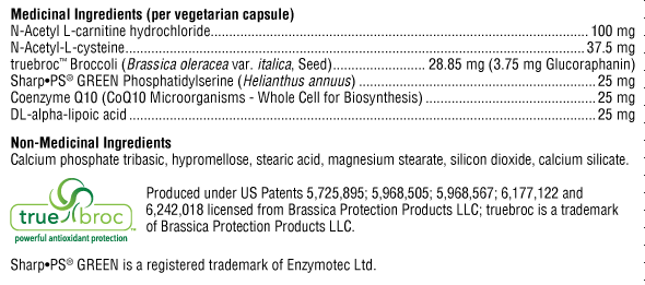 The patented form of broccoli's phytochemical called sulforaphane glucosinolate (SGS™) is a key ingredient in Active Sustain. Extensive research shows that when SGS is broken down into sulforaphane (its active form), it safely and upregulates the Nrf2 system, enhances antioxidant production, and activates vital phase II detoxification enzymes. This process provides protection against common toxins and xenobiotics.