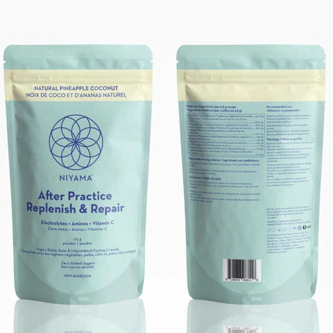 Upgrade your water and take your hydration to the next level! Adding a scoop of After Practice Replenish and Repair to your water not only quenches your thirst, but also replaces and rebalances the 6 electrolyte minerals lost through sweat (or glow?) and promotes muscle repair to reduce soreness and stiffness. In our natural pineapple and coconut flavor, it makes rehydration a scrumptious experience. Zero calories, zero sugar, and zero artificial products.