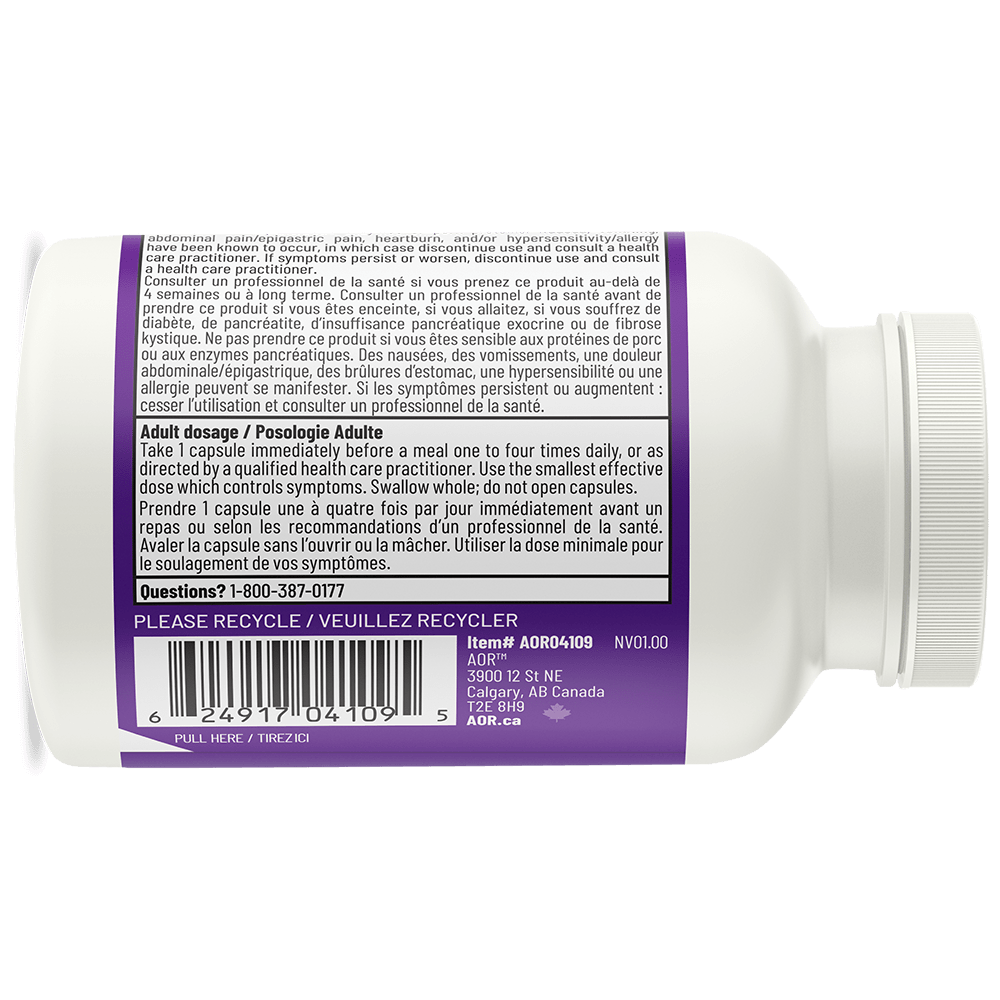 AOR Zymes is a complete digestive system support that contains proteases to digest proteins, alpha-amylase to digest starch, and lipase to digest lipids. It also contains alpha-galactosidase for the digestion of hard-to-digest polysaccharides such as those in legumes and vegetables, which are known to cause gas and bloating. AOR Zymes is a cocktail of pancreatic enzymes isolated from pork. Mammalian pancreatic enzymes are similar to those naturally occurring in the human body and are more effective than plant enzymes.