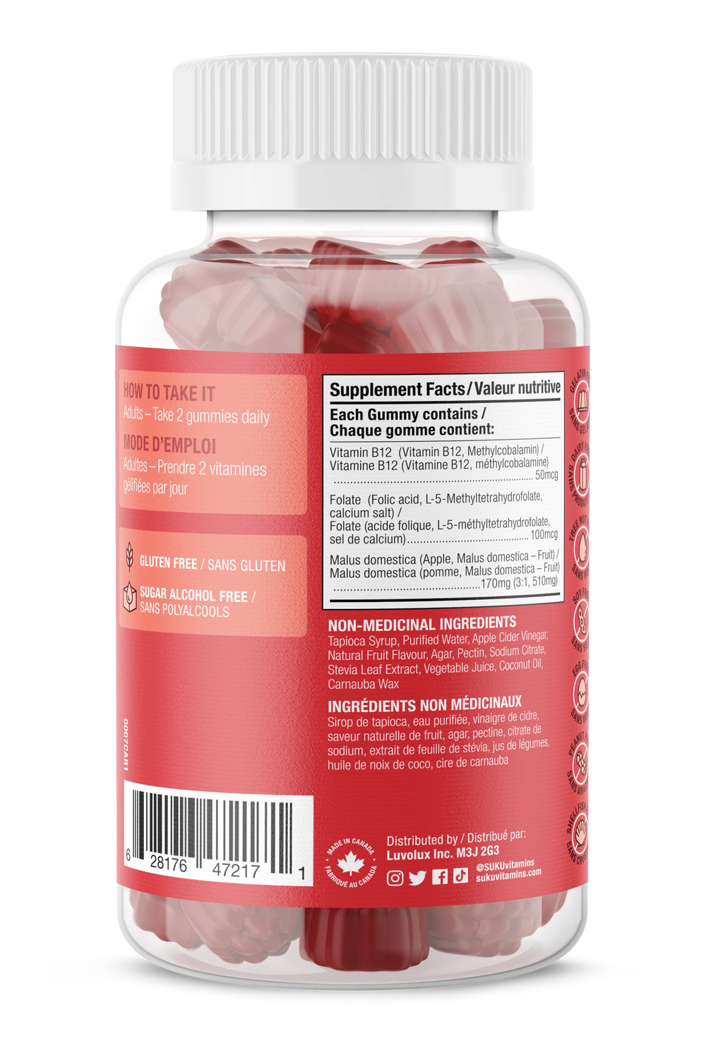 Finally, a delicious way to take apple cider vinegar without all the hassle. Two sugar-free gummies are equivalent to one dose of raw, unfiltered apple cider vinegar, complete with the mother. Each gummy is also infused with vitamin B12 to aid in energy metabolism in the body, as well as methylated folate.