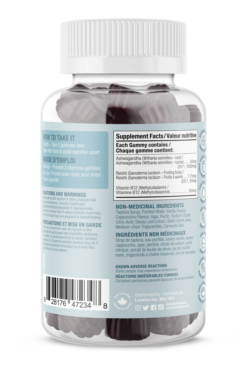 In Ayurveda, Ashwagandha is traditionally used as a sleep aid and to improve memory. It is also used as a Rasayana (rejuvenating tonic) to relieve general debility, especially during convalescence or old age, as well as to balance aggravated Vata (nervous, tonic, sedative). These gummies contribute to energy metabolism and help the immune system function properly. Each serving contains 2000mg of Ashwagandha, along with vitamin B12 and reishi.