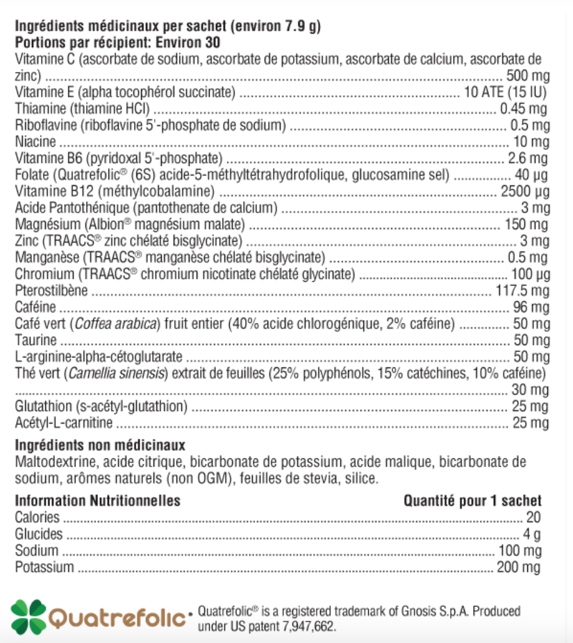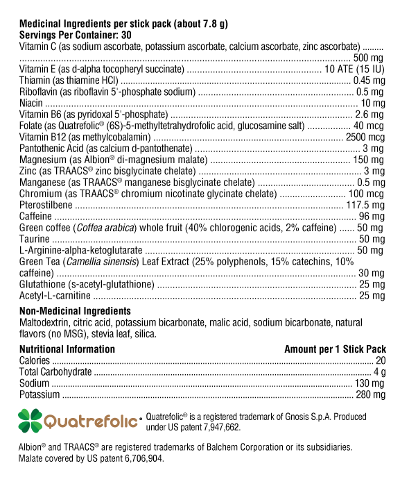ATP Ignite combines caffeine pterostilbene co-crystal in a proprietary blend with various herbs and amino acids, including green tea extract, coffee fruit extract, taurine, and L-arginine alpha-ketoglutarate. This proprietary blend is designed to complement the activities of caffeine pterostilbene co-crystal. Additionally, some of these individual ingredients, taken in high doses, play a role in mitochondrial biogenesis or are known to have a positive impact on physical performance.