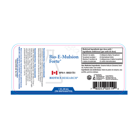 Bio-E-Mulsion Forte provides vitamin E in an emulsified liquid form to facilitate absorption and assimilation, which is especially important for people with malabsorption problems. Each drop provides 6 IU of vitamin E in the form of d-alpha tocopheryl acetate (natural vitamin E).