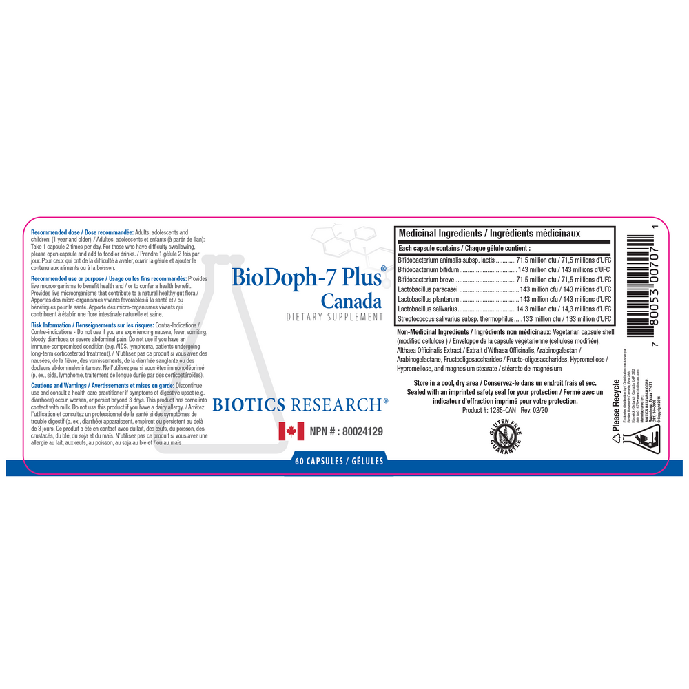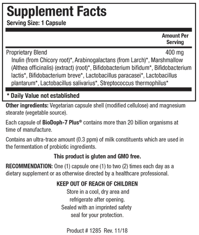 Probiotics are classically defined as "a preparation or product containing sufficient numbers of defined viable microorganisms that alter the microbiota (usually by colonization) in a host compartment and, consequently, exert beneficial effects on the health of that host." In humans, the organ considered to be the most diverse and metabolically active is the gastrointestinal tract. An integral part of an optimally functioning gastrointestinal tract is the microbial community. BioDoph-7 Plus® provides a blend of probiotics and prebiotics, including Bifidobacterium bifidum, Bifidobacterium lactis, Bifidobacterium breve, Lactobacillus paracasei, Lactobacillus plantarum, Lactobacillus salvarius, and Streptococcus thermophilus.
