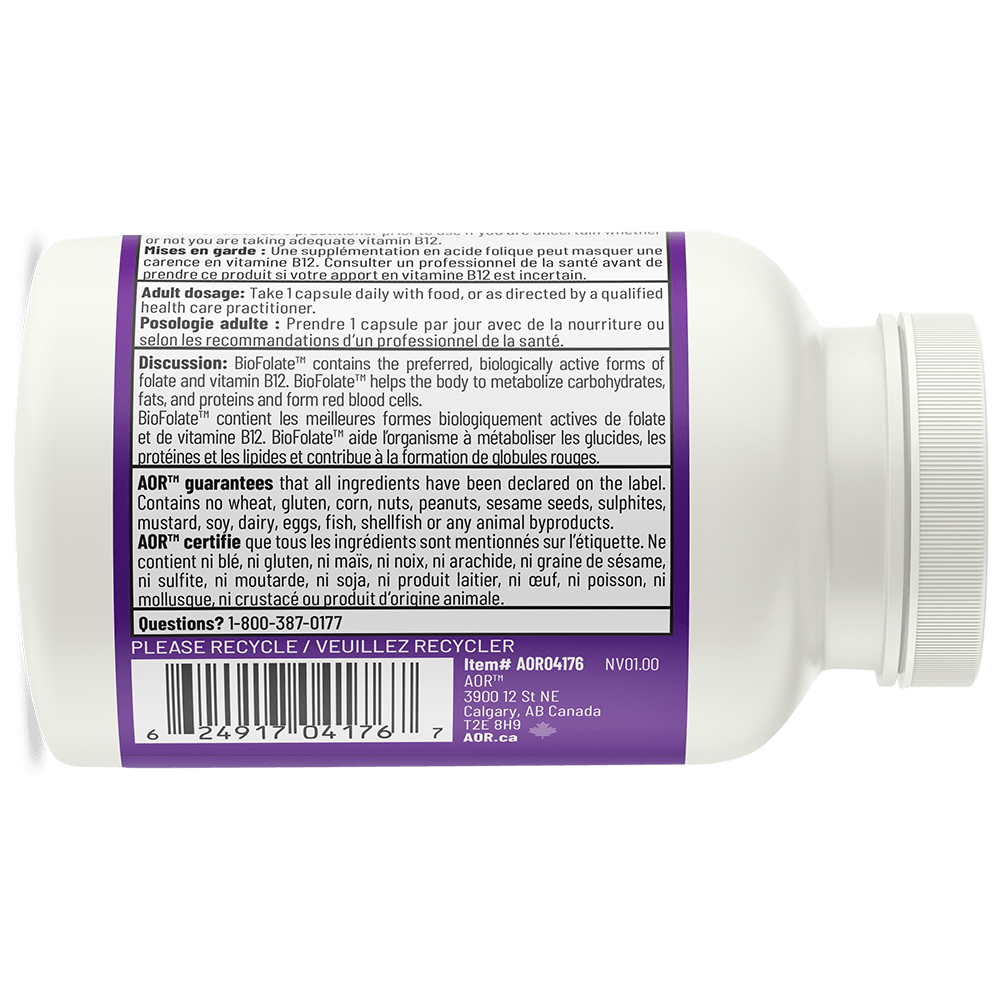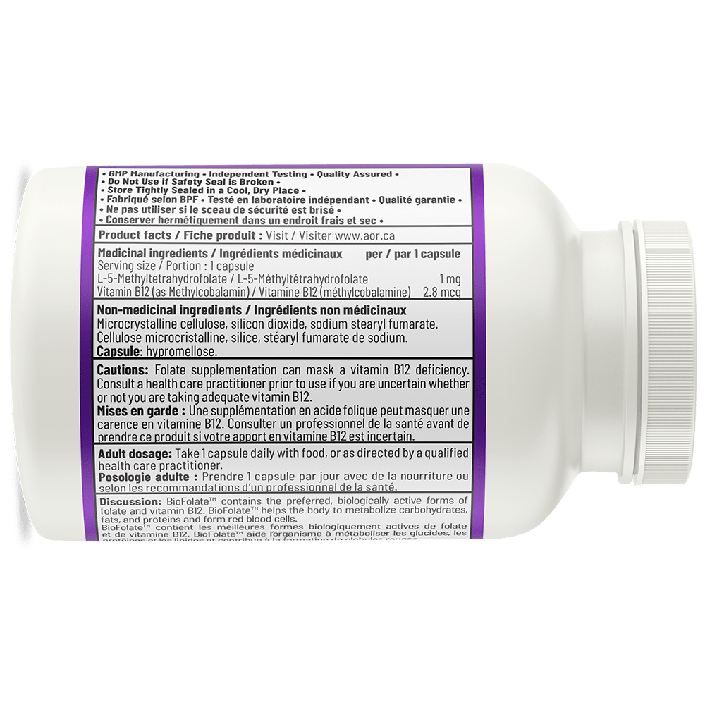 AOR's BioFolate® provides a high dose of active folate combined with minimal active vitamin B12, as folate supplementation can mask vitamin B12 deficiency. In keeping with our quality standards and philosophy, all AOR 5-MTHF products contain the purest form of L-5-MTHF on the market, guaranteed to be 99% pure.