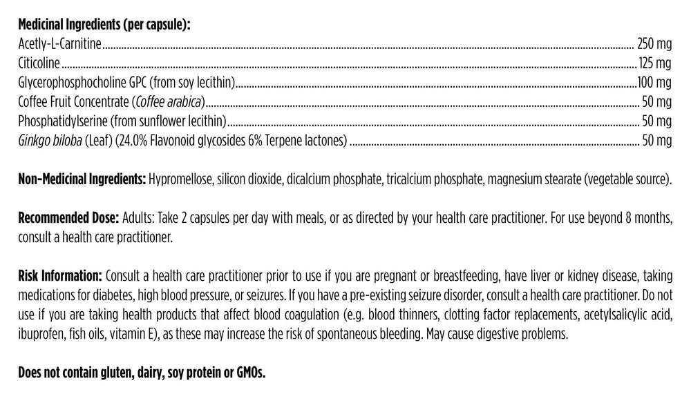 Rates of cognitive decline are rapidly increasing among Canadians. According to the Alzheimer Society of Canada, the number of Canadians with Alzheimer's disease is expected to double by 2031. Brain Vitale™ can help protect and improve brain function through four proven supernutrients. Acetyl-L-Carnitine and Phosphatidylserine rebuild and restore the nervous system by aiding the repair of brain neurons. Glycerophosphocholine (GPC) is an impressive and unique osmoprotectant that increases choline and acetylcholine levels in the central nervous system. GPC is known to improve brain function at all ages and is clinically shown to restore brain cell membranes by generating unique phospholipid-like omega-3 fatty acids. Inositol further promotes GPC by supporting the osmoprotectant action that is crucial for the second messenger function in neurons. The Ginkgo biloba in this formula is in a phytosome® form offering dual effectiveness. It improves brain microcirculation and protects the brain from oxidative damage. This amazing formula can reduce brain cell damage, helping rebuild and restore function essential for optimal brain health and cognition.