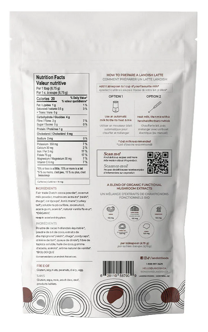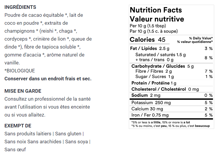 Love hot chocolate and functional mushrooms? Use this mix to make your next hot chocolate and you'll never go back to regular hot chocolate! Nourishing with a savory chocolatey taste and a rich, creamy texture, our comforting 5 Mushroom Hot Chocolate Mix has all the goodness of five organic functional mushrooms: reishi, chaga, cordyceps, lion's mane, and turkey tail. Made with organic, Fairtrade cacao and zero added sugar, it contains only 1g of net carbs per serving. Dairy and gluten free. Developed for adults, yet safe and super healthy for the whole family. IMMUNOMODULATORY PROPERTIES - Prebiotic fungal beta-glucans, found in functional mushrooms like lion's mane, reishi, chaga, turkey tail, and cordyceps, have been shown to help strengthen the immune system. VITALITY - Research suggests that cordyceps mushrooms may help increase energy delivery to muscles and that their compounds may support cognitive function and mood. GUT SUPPORT - The same prebiotic fungal beta-glucans may also have a direct impact on gut health by feeding the probiotic bacteria present in the microbiome.