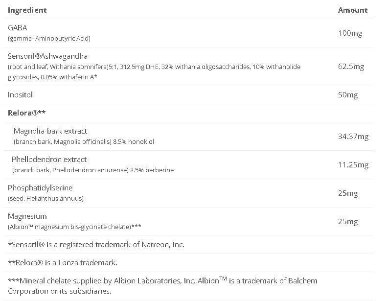 Finally, Cortico-Calm Matrix contains gamma-aminobutyric acid (GABA), magnesium, and myo-inositol to act synergistically on the stress response. GABA is the primary inhibitory neurotransmitter in the human brain. It is responsible for calming the mind and balancing neurotransmission during arousal. Studies indicate that GABA supplementation can improve relaxation and concentration during times of stress, reduce sleep latency, and increase the time spent in deep sleep. Similarly, magnesium is necessary for proper nerve and muscle function, as well as for the creation of cellular energy in mitochondria and as a cofactor for the construction of DNA, RNA, and many proteins. Magnesium is provided in its highly stable and bioavailable bis-glycinate form. Inositol, like phosphatidylserine, is a key component of the cell membrane. Inositol plays a key role in regulating communication and signaling between cells by increasing the sensitivity of cellular receptors. It has been shown to increase the sensitivity of receptors for serotonin, acetylcholine, norepinephrine, insulin, and thyroid hormones. Collectively, the mechanisms of these three supportive nutrients all indicate a reduced and more balanced stress response.