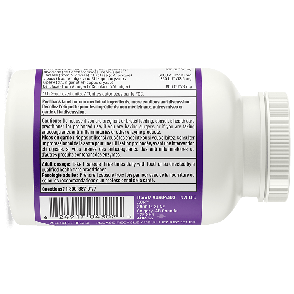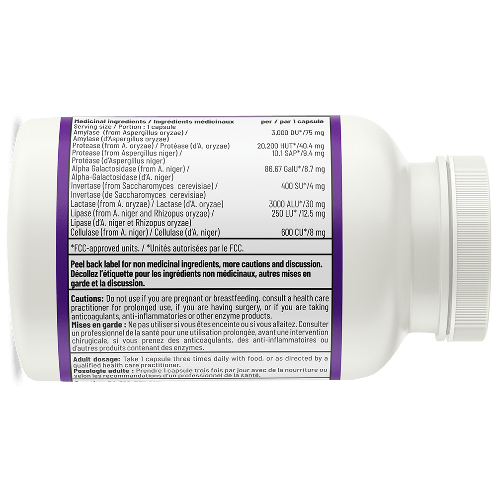 Digestase is a new and improved vegetarian enzyme formula containing a blend of plant enzymes essential for digestion, including amylase, which digests long-chain polysaccharides, two types of proteases, which digest complex proteins, lipase, which digests fats, and invertase, which digests sucrose. New additions to the Digestase formula include cellulase, which digests cellulose fiber, lactase, which digests lactose, and alpha-galactosidase, which digests oligosaccharides (the complex carbohydrates found in beans and vegetables) and reduces gas and bloating associated with these foods. In addition to improving digestion, these enzymes may also reduce inflammation and speed recovery time after injury.