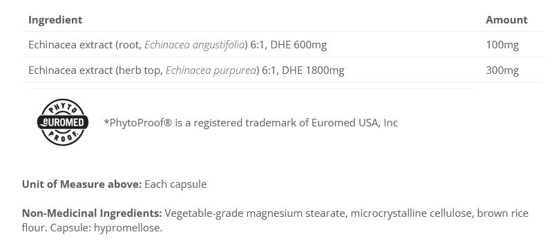 Equivalent [DHE] 600mg) of Echinacea angustifolia root extract and 300mg (6:1 extract; DHE 1800mg) of Echinacea purpurea extract, standardized to 4% echinacoside and 4% phenol content, respectively. These active ingredients are confirmed according to high-performance liquid chromatography (HPLC), the most accurate and reliable test available for herbal extracts. Each bottle of Echinacea Matrix contains 90 vegetarian capsules.