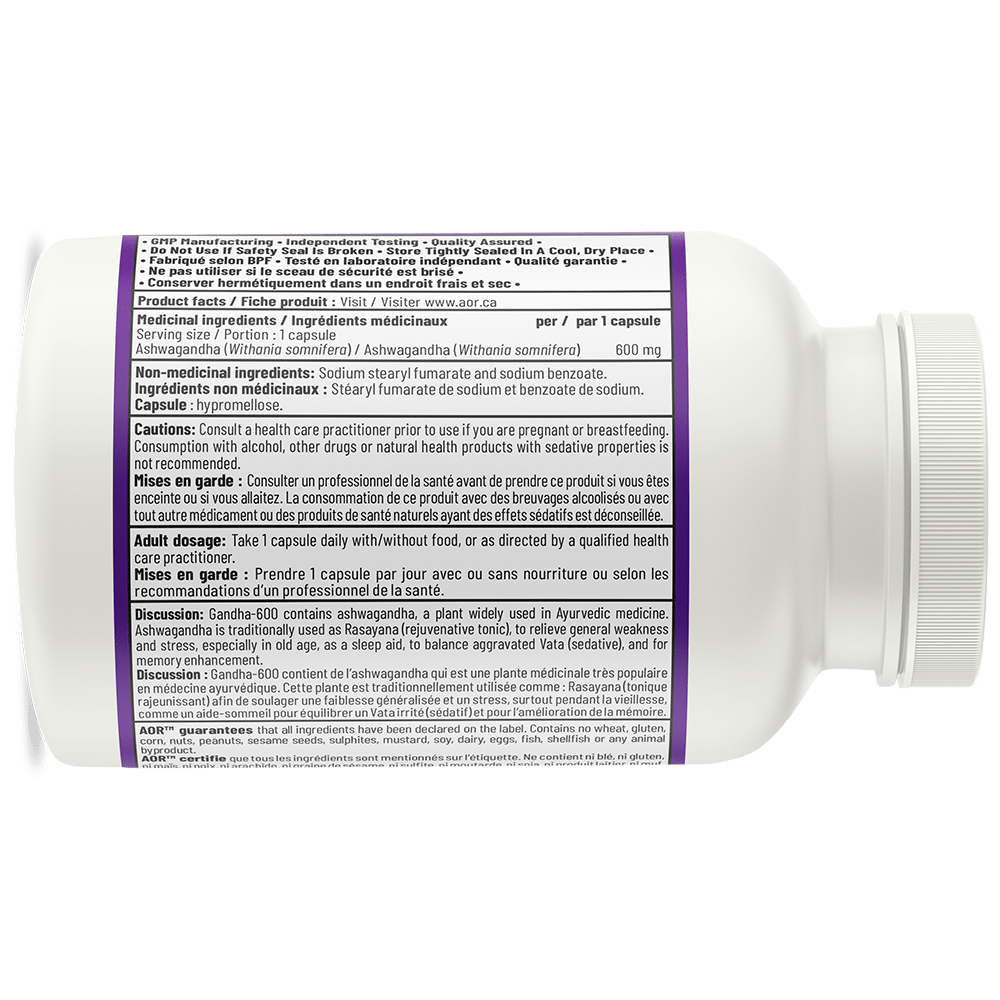 In North America, ashwagandha is increasingly known as an adaptogen, a plant that protects the body from the effects of stress. Stress, especially chronic stress, can lead to digestive problems, low vitamin C levels, adrenal exhaustion, decreased libido and sexual function, low physical endurance, and increased anxiety. Ashwagandha reduces these effects of stress, is useful for preserving mental energy, and supports the immune system. Gandha-600 is an ashwagandha extract, duly standardized into its two main anti-inflammatory and anti-stress components: withanolides and sitoindosides.