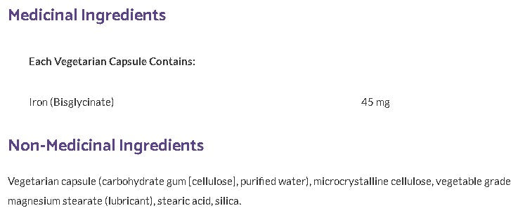 In contrast, iron bisglycinate chelate, composed of two glycine molecules chelated to ferrous iron (Fe2+), has demonstrated significantly higher bioavailability than standard forms of iron such as ferrous sulfate, ferrous fumarate, and polymaltosed iron. This form is much better tolerated, allowing iron levels to be effectively restored using lower doses. For example, at ¼ to ½ the dose of ferrous sulfate, iron bisglycinate chelate has shown similar effects on hemoglobin, ferritin, and other markers of hematologic status in controlled trials, with better tolerability. It has also been shown to be effective and well-tolerated in various patient populations, including pregnant women and children with celiac disease. 45 mg of elemental iron per capsule, higher than most formulations, is consistent with current recommendations for restoring depleted iron levels in pregnant women, although below the threshold generally associated with adverse effects.
