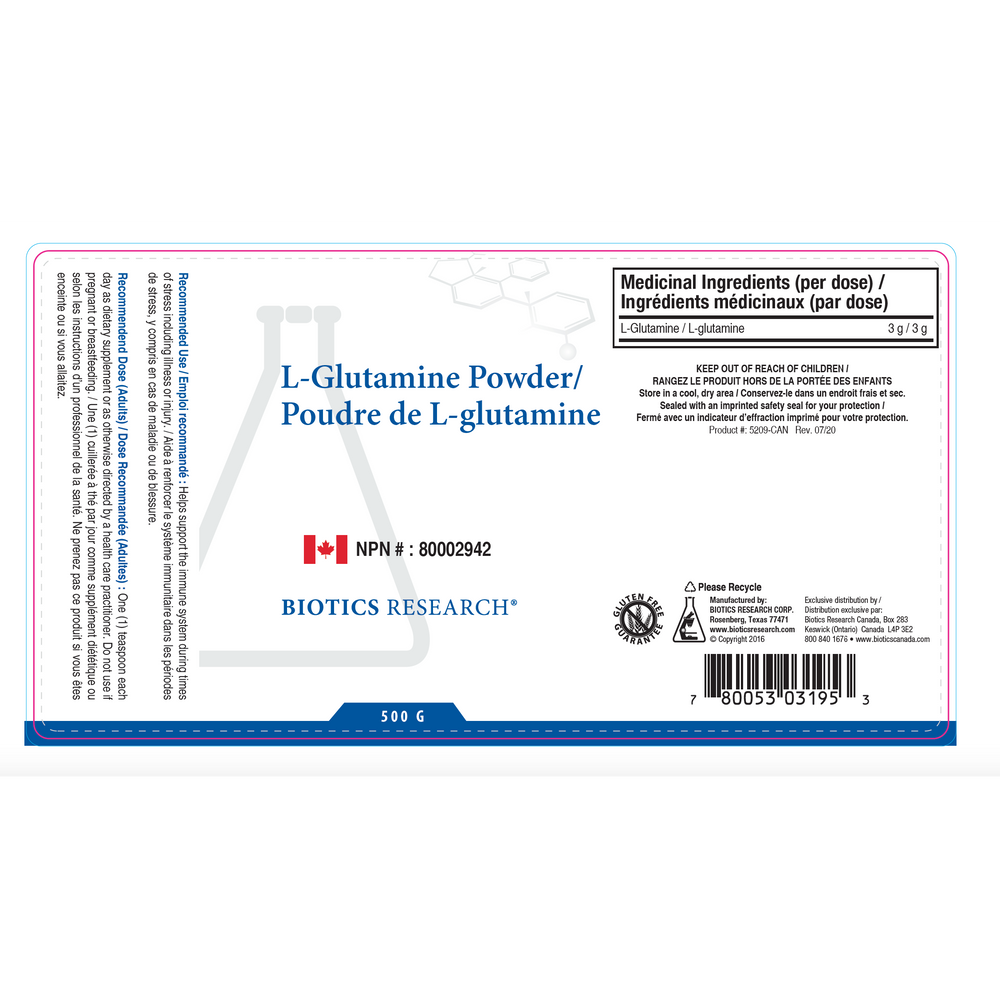 L-glutamine is the most abundant amino acid in the body. Although the body produces glutamine during times of extreme stress (such as after very intense exercise or an injury), under certain circumstances, the body may need more glutamine than it can produce. Most glutamine is stored in the muscles, followed by the lungs, where a large portion of glutamine is produced. According to the University of Maryland Medical Center (https://umm.edu.com), glutamine functions as an important compound for removing excess ammonia (a common waste product in the body). It also aids in immune system functions and appears to be necessary for normal brain function and digestion. Glutamine helps protect the gastrointestinal lining and is a major fuel for enterocytes. It also supports tissues in the body that turn over quickly, such as intestinal cells (intestinal epithelium). High cortisol levels during times of stress can deplete the body's glutamine stores. L-Glutamine Powder provides 3g of L-Glutamine per teaspoon, in unhydrolyzed, free-form L-amino acid form.