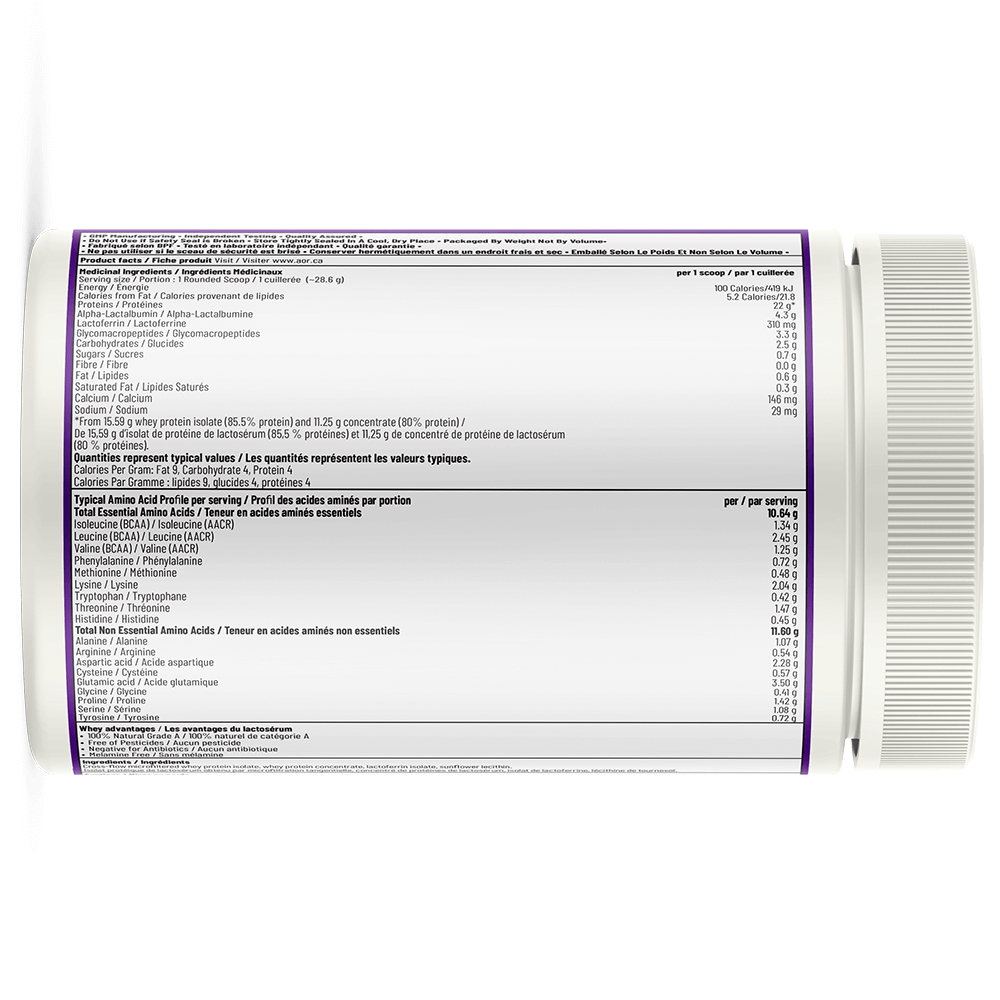 Advanced Whey is designed to be as natural and healthy as possible. Its formula uses cross-flow microfiltration to minimize protein denaturation; it contains no sugar and uses minimal flow solvents. AOR whey contains protein isolate and high-protein concentrate (75%). Together, these two components give the product a high protein content, while the concentrate contains immune-boosting factors not found in the isolate.