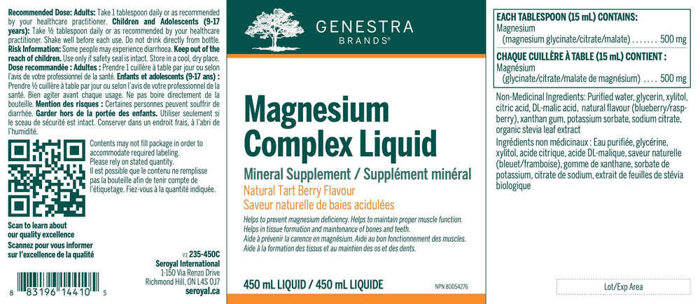 Magnesium Complex Liquid is a concentrated combination of three organic sources of magnesium, including glycinate, citrate, and malate. Magnesium is one of the most common nutritional deficiencies in Canada: more than 34% of Canadians aged 19 and older do not consume the Estimated Average Requirement (EAR) for magnesium, a number exceeding 40% among older men and women. Magnesium, the fourth most abundant mineral in the body, is a cofactor in more than 300 metabolic reactions. Magnesium plays an important role in the regulation of muscle function as a cofactor for creatine kinase, an enzyme that generates ATP from phosphocreatine stored in muscle tissue during intense exercise. Magnesium supplementation has been shown to improve anaerobic alactic metabolism and help reduce the frequency and intensity of muscle cramps in pregnant women (who generally have lower serum magnesium levels). Each tablespoon of Magnesium Complex Liquid provides 500 mg of magnesium to also support macronutrient metabolism and bone health.