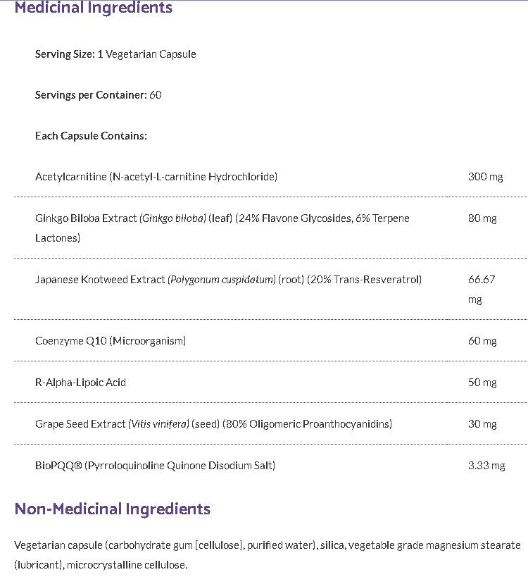 Mito AMP also contains Ginkgo biloba extract, resveratrol, R-alpha-lipoic acid, and grape seed proanthocyanidins, all of which modulate mitochondrial function, improve cognitive function, and/or reduce inflammation associated with cognitive decline. Pyrroloquinoline quinone (PQQ) plays a key role in mitochondrial biogenesis through cellular signaling (PGC-1 alpha). Clinical trials have shown improved cerebral blood flow and brain function, improved memory when combined with CoQ10, as well as increased vigor and significant reductions in symptoms of fatigue, tension, low mood, and confusion.
