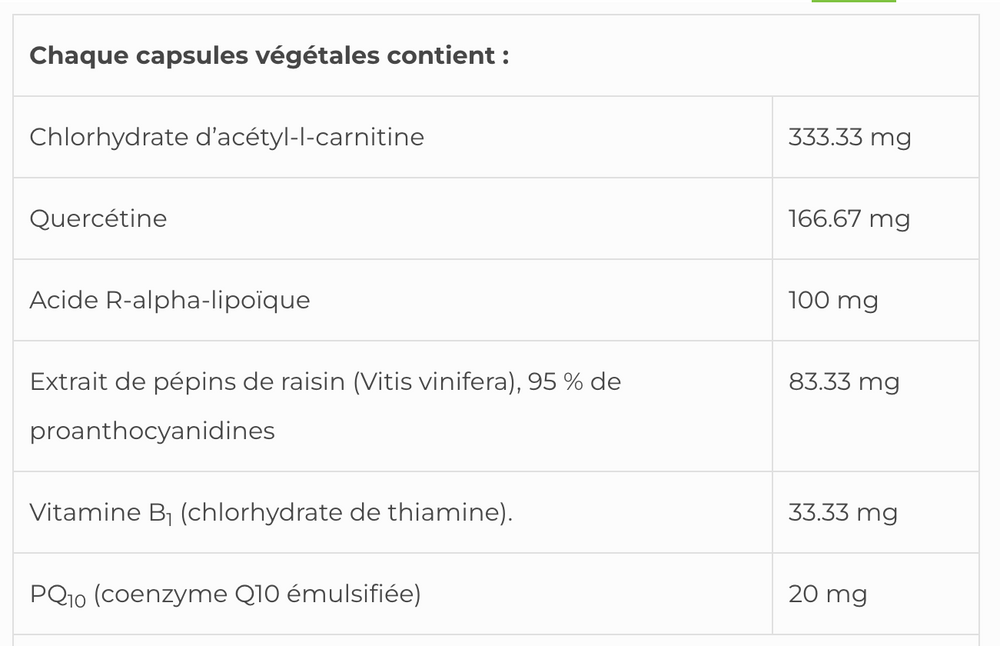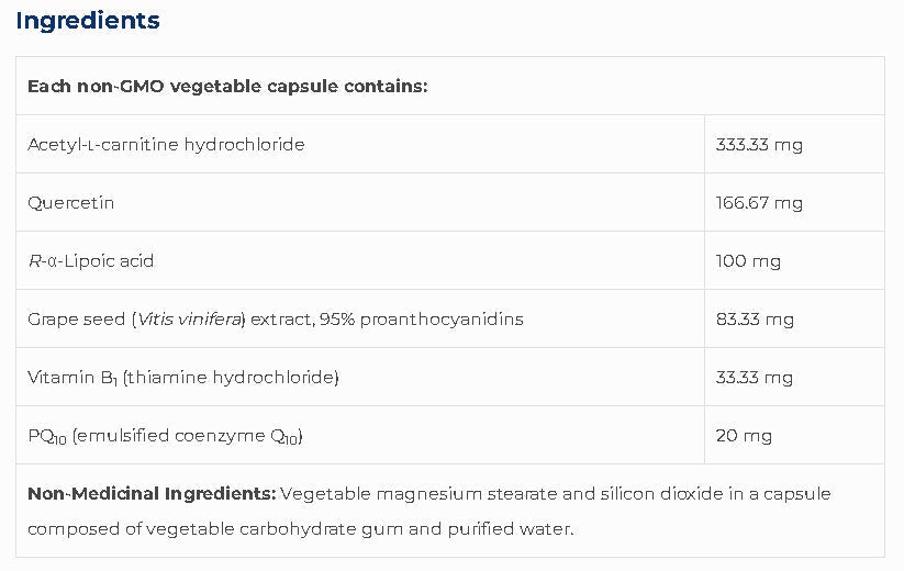 Mito SAP contains a combination of active ingredients, namely N-acetyl-L-carnitine, quercetin, R-α-lipoic acid, grape seed extract, thiamine and coenzyme Q10 (as PQ10; pea-emulsified coenzyme Q10 for better absorption) of the highest quality and potency for optimal mitochondrial support.