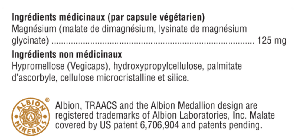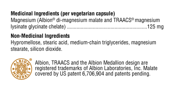 OptiMag® 125 contains Albion® TRAACS® magnesium lysinate glycinate (a mineral amino acid chelate) and Albion's chelated dimagnesium malate, both formulated for enhanced absorption. Malic acid (from dimagnesium malate) supports energy production and lactic acid removal through the Krebs cycle. Malic acid can also support antioxidant systems by strengthening glutathione and antioxidant enzymes.