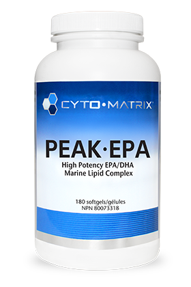 One challenge with omega-3 fatty acid supplementation is poor compliance. Most supplements require multiple capsules or teaspoons per day to achieve an evidence-based dose of EPA and DHA. Cyto-Matrix's Peak-EPA solves this problem by providing 700 mg of EPA and 350 mg of DHA in a single capsule. These omega-3 fatty acids, sourced from wild-caught sardines, salmon, and anchovies, are in the well-researched ethyl ester form, allowing for evidence-based, highly concentrated, and cost-effective delivery.