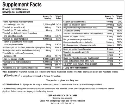 It includes essential vitamins and minerals, as well as important botanical constituents with significant antioxidant activity. It includes physiological levels of important micronutrients, active forms of vitamins for functional effectiveness, stable and effective phytonutrient support, and low-intensity piperine (from black pepper) for increased absorption and response.