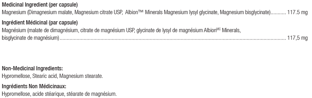 Magnesium is a mineral used by all organs in the body, especially the heart, muscles, and kidneys. According to the 2012 Canadian Community Health Survey (CCHS), approximately 30% of men and 35% of women aged 19 to 30 are magnesium deficient. Magnesium insufficiency has been implicated in a wide range of health problems. Most magnesium supplements use only a single source of magnesium, which can easily overload a single absorption pathway. Reacted Magnesium takes advantage of unique absorption pathways by providing magnesium in the form of di-magnesium malate, magnesium bisglycinate, magnesium citrate, and magnesium glycinate for better absorption, utilization, and gastrointestinal comfort. Some people taking other forms of magnesium supplements experience gastrointestinal side effects, including gas, bloating, diarrhea, constipation, or a combination of these symptoms. The forms of magnesium used in Reacted Magnesium maintain gastrointestinal comfort while maximizing absorption and restoring magnesium levels in the body.