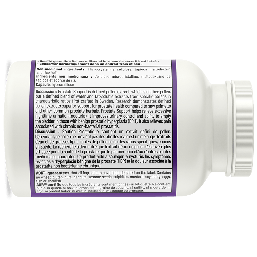 Prostate Support is a product designed to relieve the symptoms of benign prostatic hyperplasia (BPH). Its main ingredient is pollen extract, which is different from bee pollen. Bee pollen is a random mixture of pollens that insects have come into contact with, while pollen extract is a very specific mixture of pollens from several specific cereal plants.