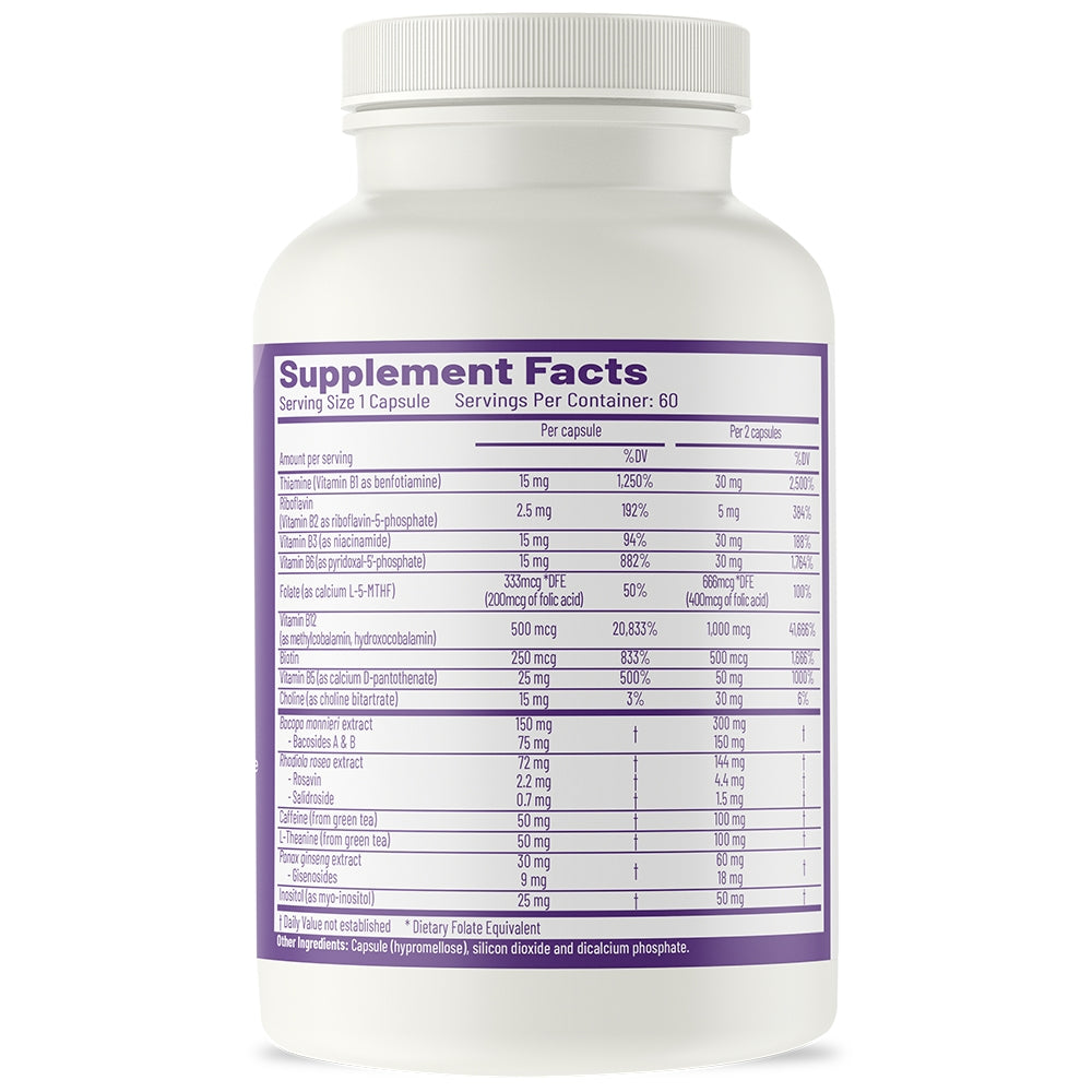 This specific combination of medicinal plants and B vitamins ensures that the stimulating effects of caffeine, ginseng and rhodiola are balanced with the calming effects of L-theanine, inositol and bacopa.