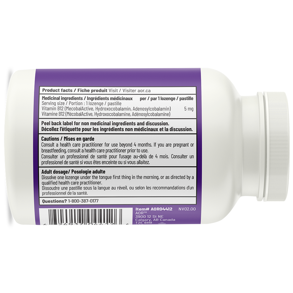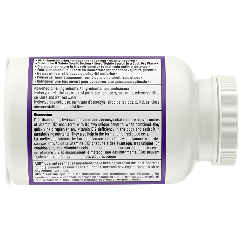 AOR's Tri B12 Synergy is a combination of three active and independent forms of vitamin B12. Methylcobalamin, hydroxocobalamin, and adenosylcobalamin are three distinct cobalamin factors, each with its own unique benefits. Taken together, they provide an appropriate dose of bioavailable and active forms of B12 for comprehensive support in compensating for a deficiency. Vitamin B12 deficiency can result from poor diet, altered microbiota, or malabsorption caused by diseases such as Crohn's disease or celiac disease, or the use of proton pump inhibitors such as antacids. Populations particularly at risk include the elderly, vegans, and smokers. Chronic antibiotic use and even genetic factors can also increase the risk.