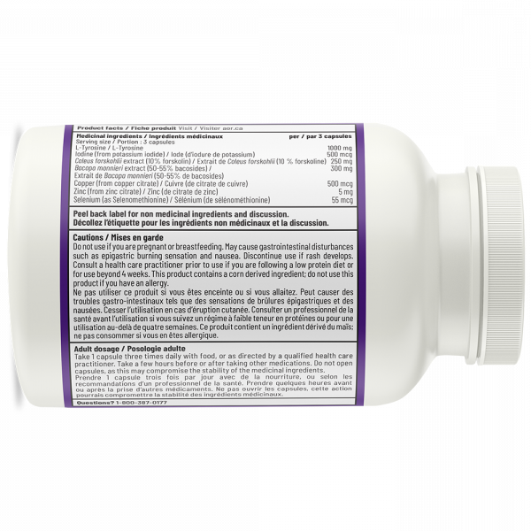 Thyro Support ingredients include the amino acid tyrosine, the herbs Coleus forskohlii and Bacopa monnieri, and the essential minerals iodine, zinc, copper, and selenium.