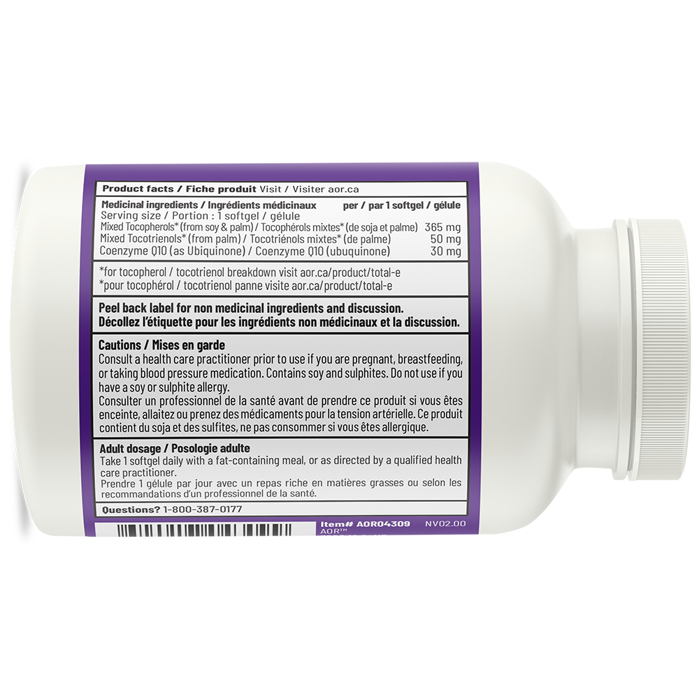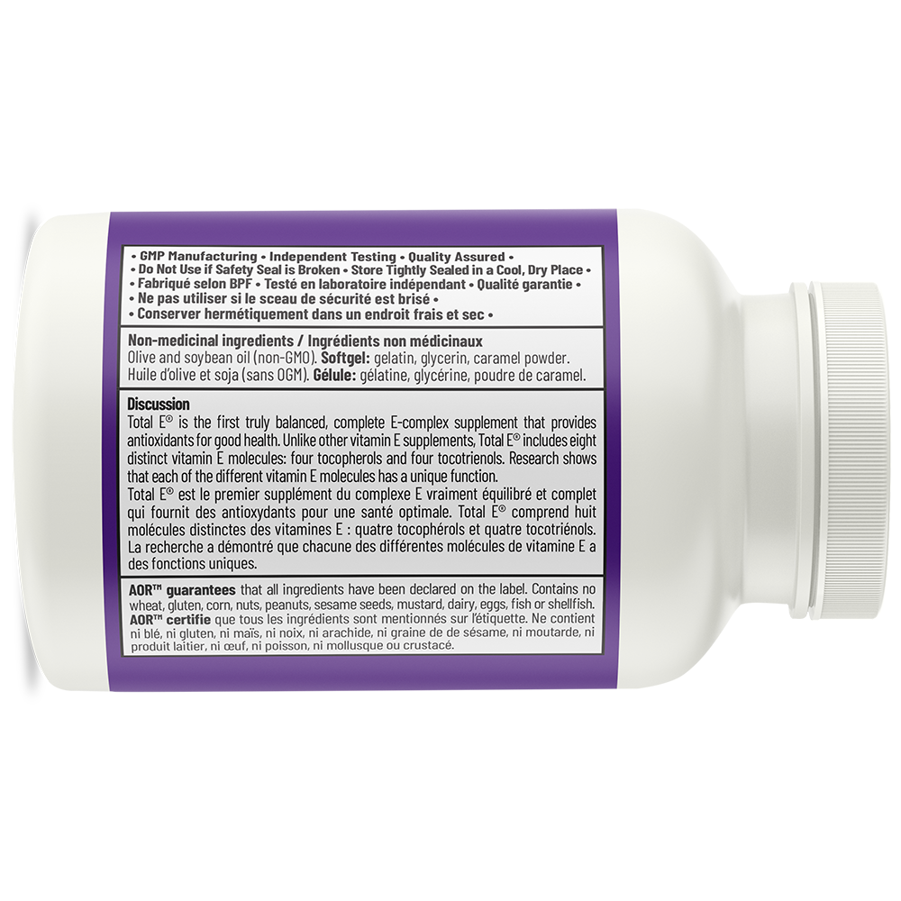 AOR's Total E is made with exclusively natural ingredients and contains all eight vitamin E molecules in their natural proportions. This formula also contains Coenzyme Q10, which plays a vital role in "recycling" vitamin E into its active (antioxidant) forms.