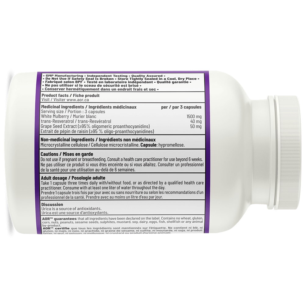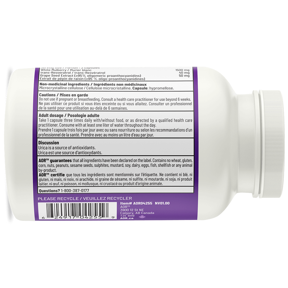 Urica was designed to help lower uric acid levels in the body, thereby reducing the frequency and severity of gout attacks. This formula may also be beneficial for those with high uric acid levels or impaired kidney function. Urica contains a high dose of morin-rich mulberry extract and supportive doses of resveratrol and grape seed extract. Morin works on the kidneys to promote the body's excretion of uric acid and also helps reduce its production by inhibiting the enzyme xanthine oxidase, which converts certain compounds into uric acid. Polyphenols from resveratrol and grape seed extract also work on the kidneys and reduce xanthine oxidase activity.