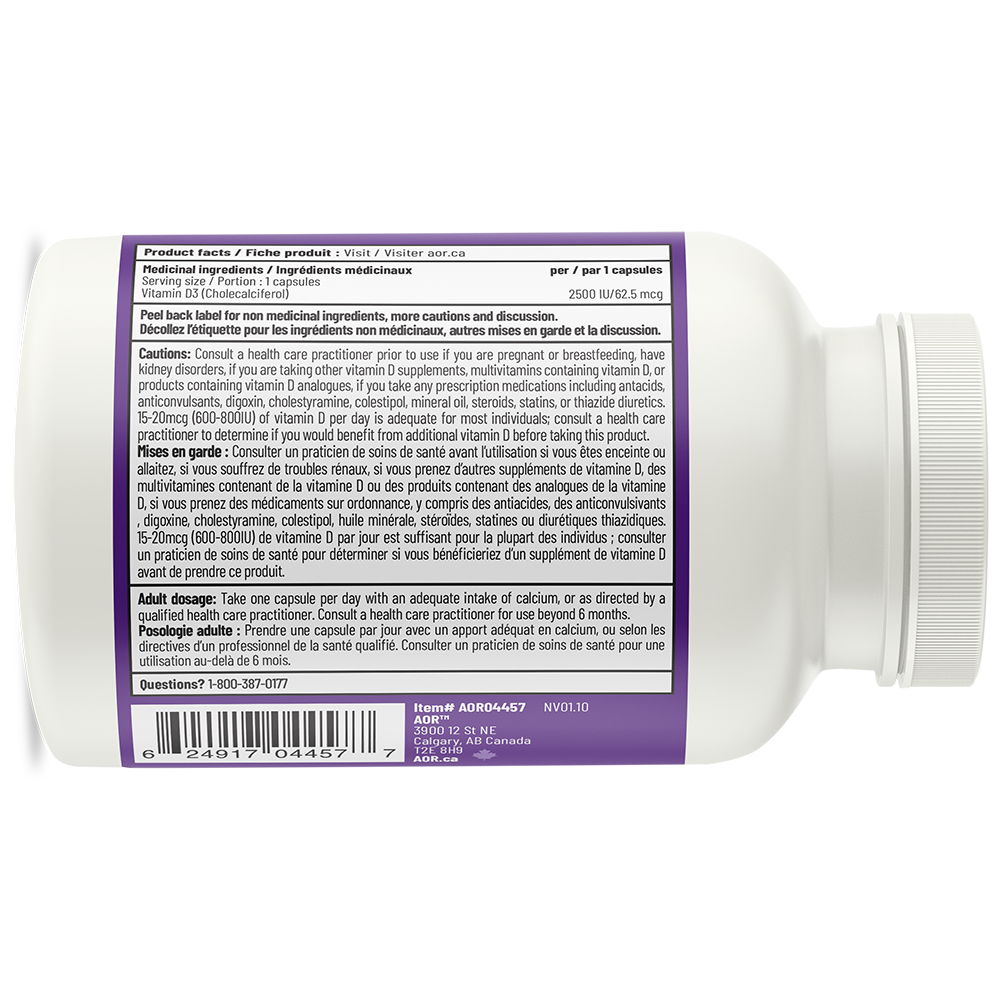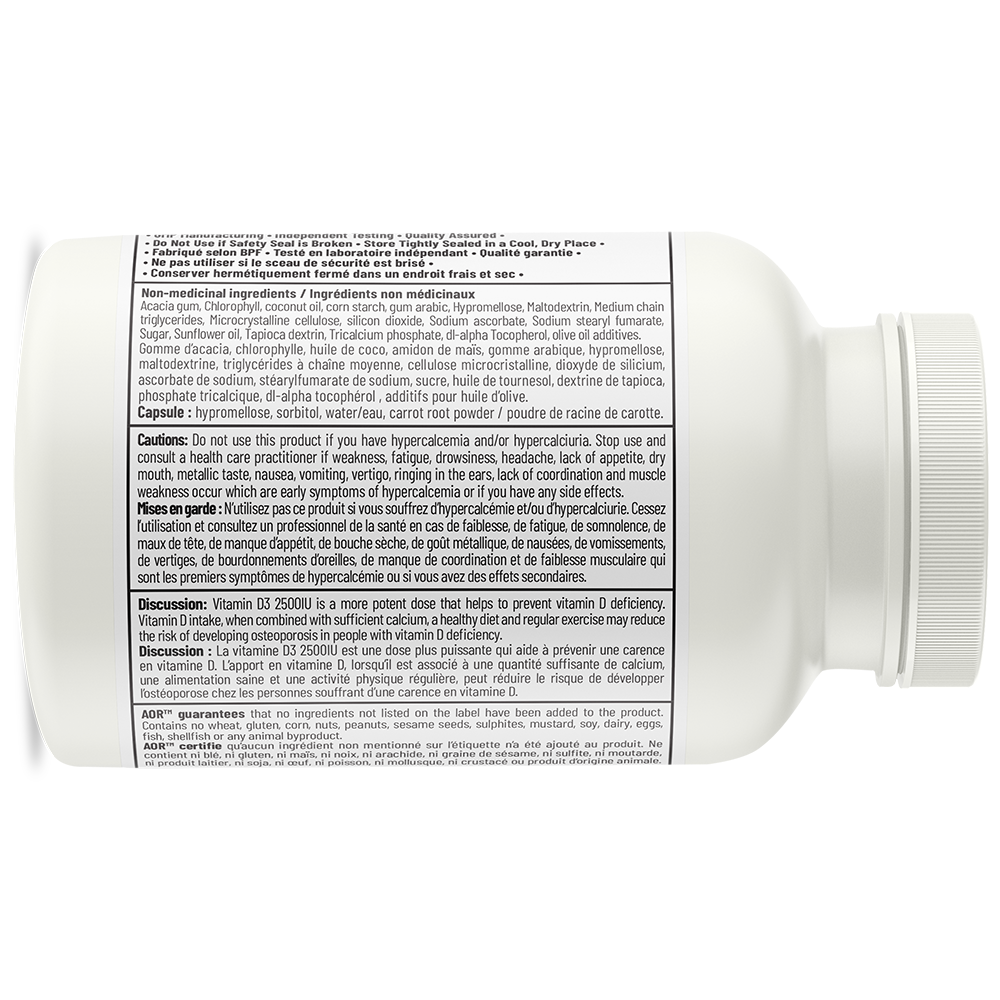 Medicinal Ingredients (per capsule): Vitamin D3 (cholecalciferol) ...... 2500 IU / 62.5 mcg