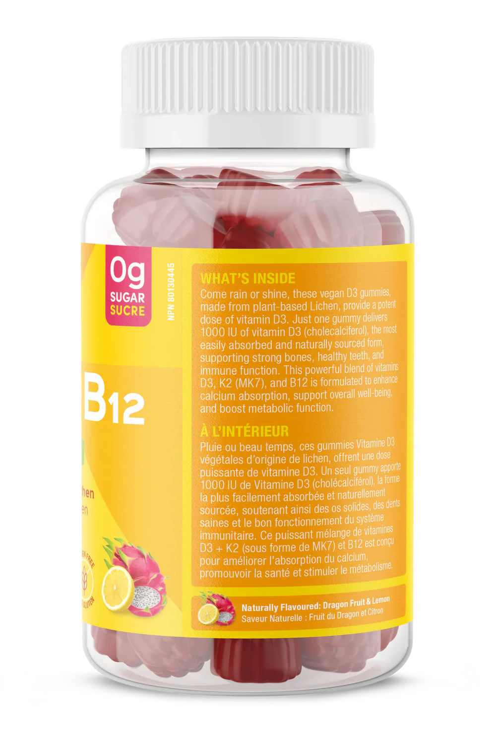 Qu'il pleuve ou qu'il vente, ces gélifiés D3 végétaliens, fabriqués à partir de lichen végétal, fournissent une puissante dose de vitamine D3. Un seul gélifié fournit 1000 UI de vitamine D3 (cholécalciférol), la forme la plus facilement absorbée et d'origine naturelle, qui favorise la solidité des os, la santé des dents et la fonction immunitaire. Ce puissant mélange de vitamines D3, K2 (MK7) et B12 est formulé pour améliorer l'absorption du calcium, soutenir le bien-être général et stimuler la fonction métabolique.