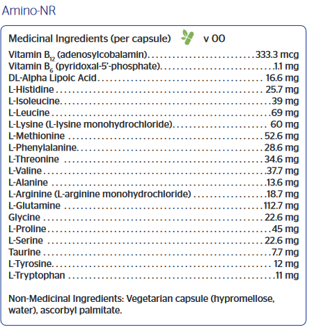 Amino-NR est un complexe d'acides aminés dans des rapports naturels favorisant le bien-être quotidien. Les acides aminés sont des éléments indispensables à toutes les protéines, ce qui les rend essentiels à un grand nombre de fonctions de l'organisme, y compris l'équilibre hydrique, la production d'enzymes, la réparation cellulaire et le métabolisme énergétique. Pour tout le monde, des athlètes entraînés aux personnes âgées, les acides aminés jouent un rôle important dans la synthèse de protéines musculaires. Les acides aminés fournissent également un soutien important en contribuant au développement de la masse musculaire maigre lorsqu'ils sont combinés avec un entraînement en résistance régulier et une alimentation saine et équilibrée. Cette formule est basée sur les rapports d'acides aminés qu'on retrouve naturellement dans les sources de protéines de haute valeur biologique. En plus d'offrir un mélange complet d'acides aminés, Amino-NR fournit de la taurine. Il contient également de l'acide alpha-lipoïque, qui fournit un soutien antioxydant favorisant le maintien d'une bonne santé, tandis que la vitamine B6 joue un rôle de cofacteur pour un métabolisme sain des acides aminés.