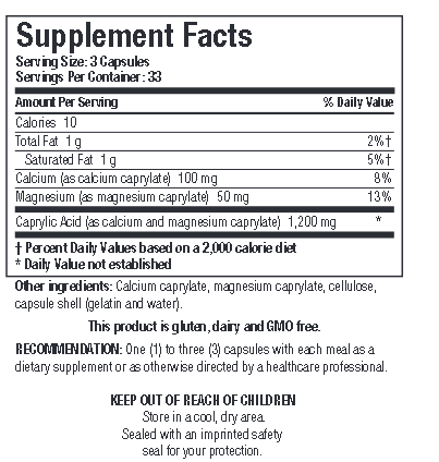 Caprin™ fournit une source d'acide caprylique (sous forme de caprylate de calcium et de magnésium). L'acide caprylique est un acide gras à chaîne moyenne, qui soutient une flore intestinale saine. Chaque capsule fournit 400 mg d'acide caprylique sous forme de caprylate de calcium/magnésium.