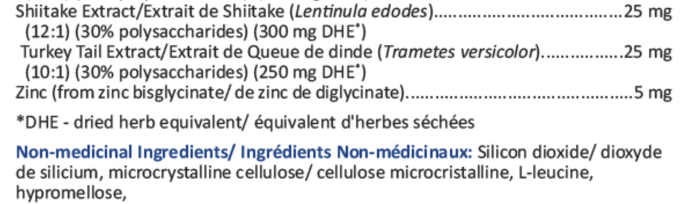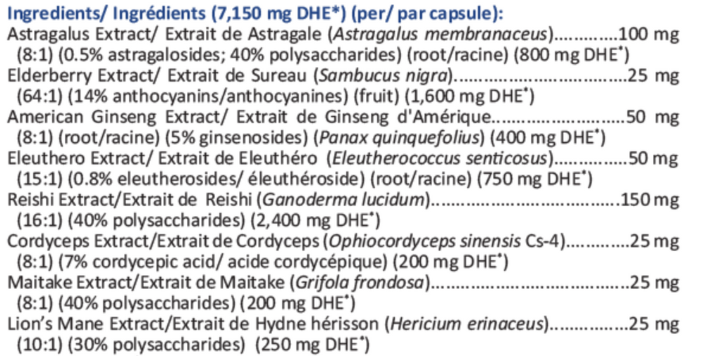 Contient des extraits hautement concentrés (7 150 mg de DHE*/capsule) d'astragale, de sureau, de ginseng américain, d'éleuthéro et un mélange synergique d'extraits de champignons médicinaux