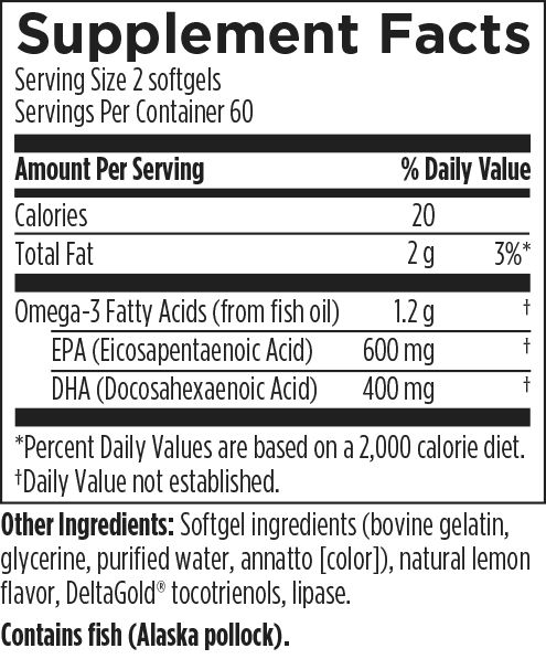 OmegAvail Ultra est composé d’un mélange d’acides gras (AG) essentiels oméga-3 (n-3) à haute puissance, fournissant (dans chaque portion de deux gélules) 600 mg d’EPA, 400 mg de DHA et 200 mg d’autres acides gras oméga-3 prove- nant d’huiles de poisson, ainsi que le soutien digestif de la lipase pour une meilleure absorption des lipides. Ce produit peut être un choix idéal lorsque des effets plus puissants des omégas-3 sont recherchés.