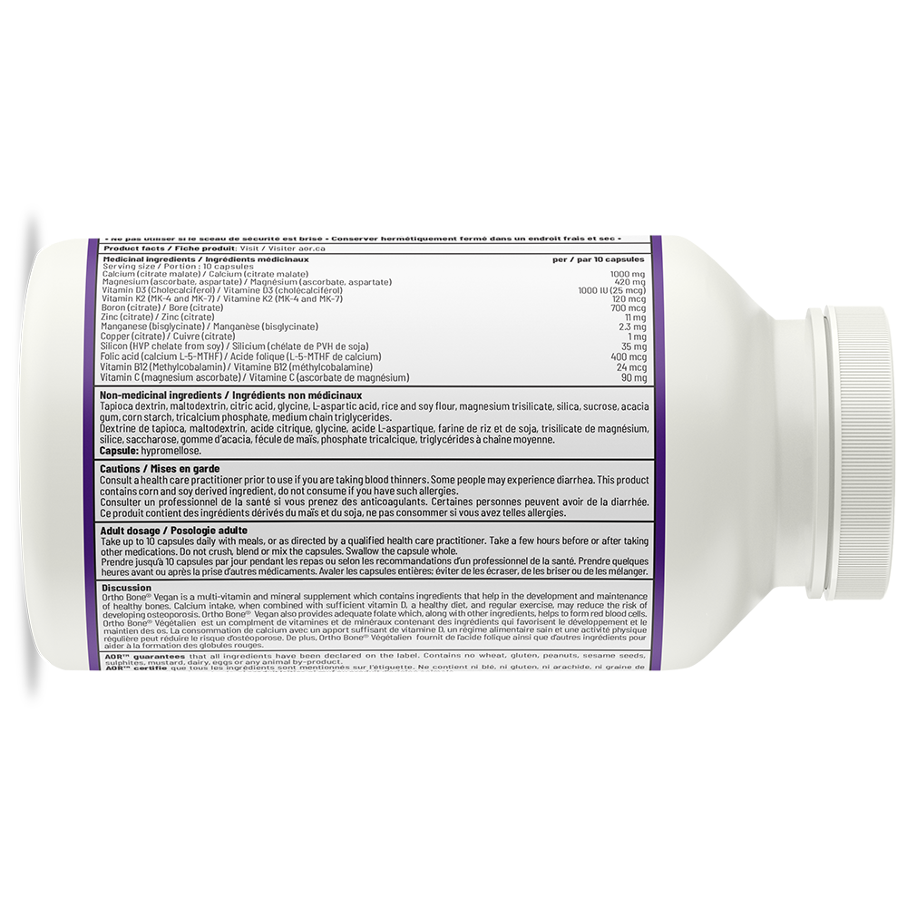 Bien que le calcium soit important, il ne représente qu’une partie du tableau, et de nombreux autres nutriments sont nécessaires pour maintenir des os solides et sains. Ortho Bone® Végétalien fournit également les vitamines D et K pour une absorption et utilisation appropriées du calcium, de la vitamine C et du silicium pour le soutien de la production de collagène, du magnésium qui constitue une grande partie de la matrice minérale osseuse, du bore pour la réduction de la perte de magnésium, et d’oligo-minéraux tels que le zinc, le cuivre et le manganèse, qui sont des co-facteurs des enzymes impliquées dans la croissance et la réparation osseuses. Enfin, les vitamines B12 et le folate sont inclus pour aider à réduire l’homocystéine, un sous-produit métabolique toxique pour les fibres osseuses.