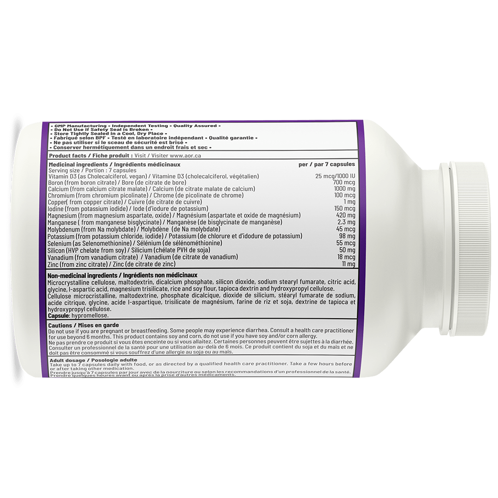Ortho Minéraux a été conçu pour être un supplément minéral équilibré et efficace, fournissant seulement les meilleures forme, ratio et dose de chaque ingrédient. Ortho Minéraux contient de la vitamine D et 13 minéraux, dont certains sont essentiels et d’autres non reconnus comme essentiels, mais sont suggérés dans la recherche comme ayant des effets biologiques importants. En raison de la grande prévalence de la carence en minéraux, la plupart des gens peuvent tirer profit d’Ortho Minéraux. Une supplémentation en minéraux est particulièrement importante pour les sportifs ou personnes ayant des muscles tendus ou l’ostéoporose et celles suivant un traitement par chélation.