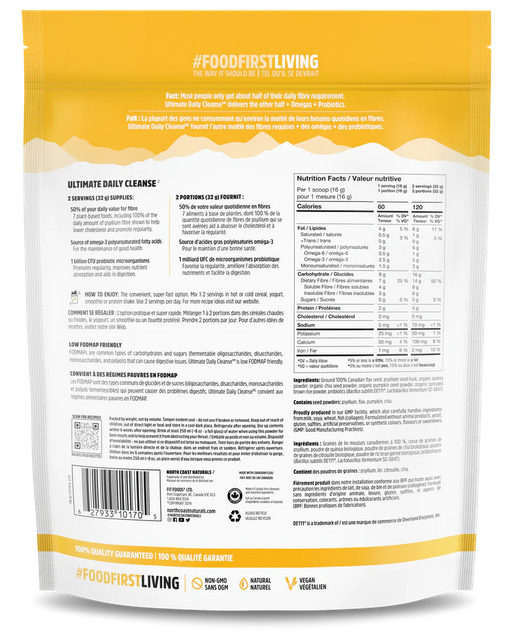 La plupart des Nord-Américains ne consomment que la moitié des fibres quotidiennes recommandées. Ultimate Daily Cleanse ™ aide à combler ce vide en fournissant 50% de votre apport quotidien en fibres provenant de sources réelles à base d'aliments entiers. Bien que les fibres soient essentielles pour la santé, il est essentiel de choisir la bonne source, en particulier lorsque vous avez des problèmes intestinaux.