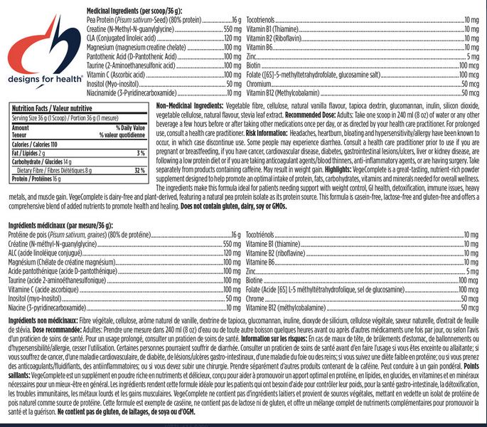 VegeComplete est une poudre d’aliments fonctionnels sans produits laitiers et riche en nutriments, conçue pour aider à assurer des apports optimaux en protéines, lipides, glucides, vitamines et minéraux nécessaires au bien-être général. Ce produit est fait à base d’un isolat naturel de protéines de pois et ne contient pas de caséine, de lactose ou de gluten. VegeComplete est un choix idéal pour les personnes allergiques au lait et aux produits laitiers qui doivent éviter la caséine ou les protéines de lactosérum, et pour les personnes intolé- rantes au lactose.